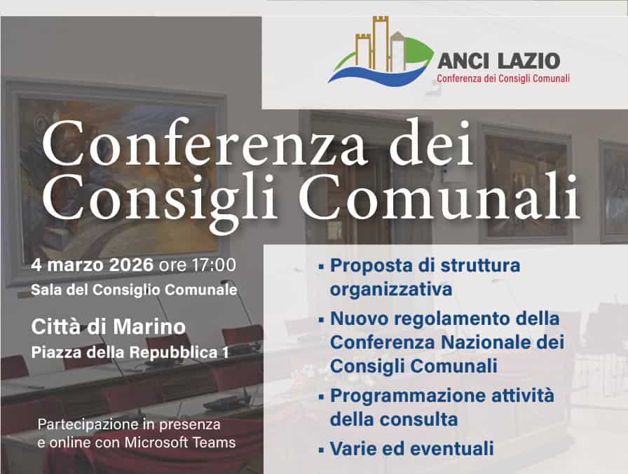 Il prossimo 4 marzo 2026, alle ore 17:00, la Città di Marino ospiterà un importante appuntamento istituzionale organizzato da ANCI Lazio: la Conferenza dei Consigli Comunali. L’incontro si svolgerà presso la Sala del Consiglio Comunale, in Piazza della Repubblica 1.